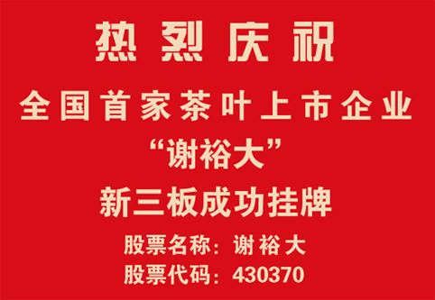 2013年12月31日,謝裕大茶葉股份有限公司首家通過全國中小企業(yè)股份轉(zhuǎn)讓系統(tǒng)(即:新三板)的股票掛牌申請(qǐng)受理,并于1月24日正式掛牌上市——股票代碼:430370、股票名稱:謝裕大。