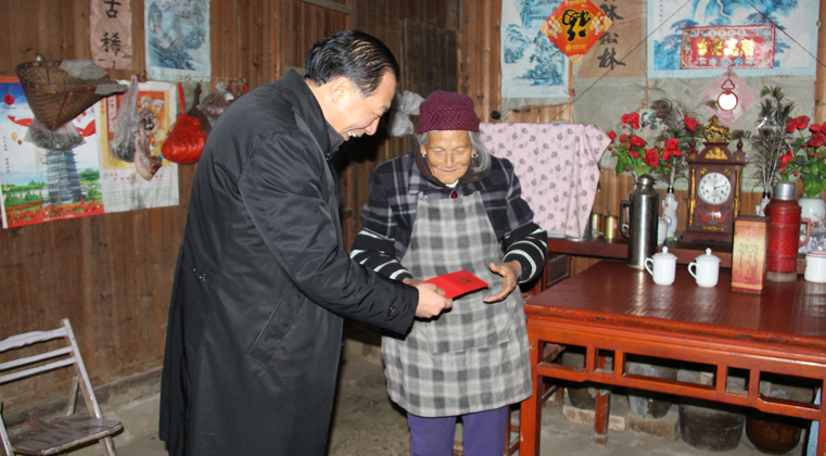謝一平操著濃厚的鄉(xiāng)音和方言,與鄉(xiāng)親們親切交談,關(guān)心詢問老人的生活情況與身體狀況,向老人們送上慰問金(品)和祝福,祝老人們?cè)谛碌囊荒昀锬軌蚪】怠㈨樞模?