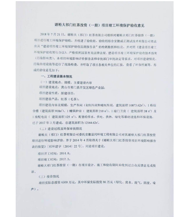 謝裕大祁門紅茶投資項目竣工環(huán)境保護驗收意見pdf下載