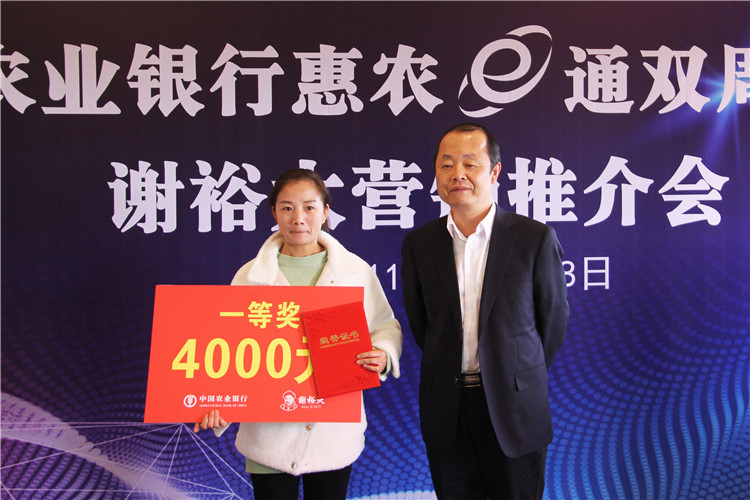 【中國農(nóng)業(yè)銀行黃山徽州支行黨委書記、行長張興龍為一等獎獲獎商戶頒獎】