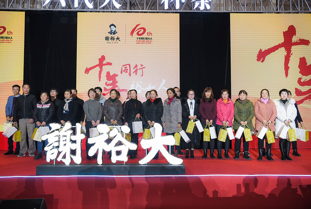 謝裕大生產(chǎn)總監(jiān)馮濤(左一)為新一批“十年同行裕大人”獲得者贈禮
