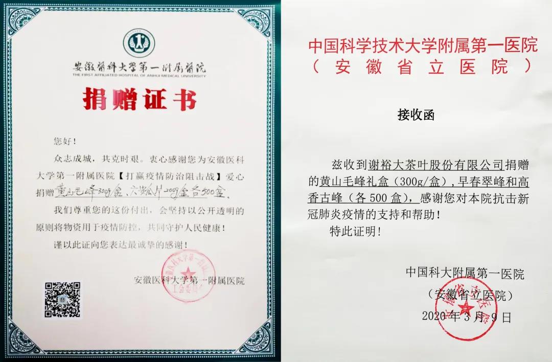 疫情爆發(fā)后,從武漢到全國(guó),無(wú)數(shù)醫(yī)務(wù)人員堅(jiān)守、奮斗在疫情阻擊戰(zhàn)第一線,成為了中國(guó)最美“逆行者”,他們的身心健康一直牽掛著全國(guó)人民的心。3月8-9日,謝裕大茶葉股份有限公司將兩批共400箱總價(jià)值60余萬(wàn)元的愛心茶分別捐贈(zèng)給安徽醫(yī)科大學(xué)第一附屬醫(yī)院和中國(guó)科學(xué)技術(shù)大學(xué)第一附屬醫(yī)院,致敬奮戰(zhàn)在抗疫一線的白衣戰(zhàn)士!
