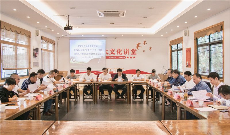 10月12日,安徽省市場監(jiān)督管理局(以下簡稱“市監(jiān)局”)黨組成員、副局長楊燚攜食品生產(chǎn)處長、黨支部書記張斌、副處長張強等一行赴謝裕大開展民營企業(yè)和“小個專”黨建聯(lián)系點的走訪調(diào)研活動,黃山市市監(jiān)局局長李煒、副局長王文武,徽州區(qū)人民政府副區(qū)長張強,區(qū)市監(jiān)局副局長胡利順、王梅等領導全程共同參加。