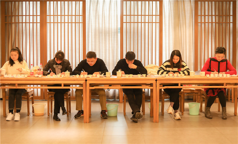 實操板塊分為六大基本茶類干茶辨識、茶湯辨識找對杯和茶湯沖泡比氣(香氣)味(滋味)三個分項賽。其中,干茶辨識環(huán)節(jié)共8分鐘,在六大基本茶類中選取6款代表性茶樣,進(jìn)行辨識后寫明品名、產(chǎn)地、歸屬;茶湯辨識環(huán)節(jié)選手從5款茶湯中通過“觀色”、“聞香”、“品湯”選出兩杯茶品類相同的茶湯;15分鐘沖泡環(huán)節(jié)為兩人一組,每人被隨機(jī)指定沖泡2款茶,由工作人員呈至七人評委組進(jìn)行盲評打分。期間,沖泡環(huán)節(jié)現(xiàn)場尤為激烈,經(jīng)過前期一個月的練習(xí)準(zhǔn)備,每組選手都摩拳擦掌,紛紛亮出絕技,熟練地進(jìn)行溫杯、洗茶、注水、出湯等操作,充分展現(xiàn)了專業(yè)的個人技能及敬業(yè)態(tài)度。