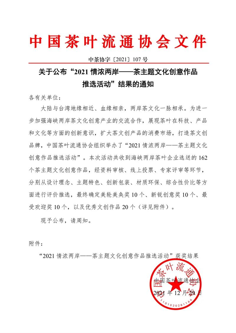 據(jù)悉,“2021情濃兩岸一一茶主題文化創(chuàng)意作品推選活動”是由中國茶葉流通協(xié)會舉辦,以進一步加強海峽兩岸茶文化創(chuàng)意產(chǎn)業(yè)的交流與合作,展開茶葉在科技、文化等方面的創(chuàng)新意識,擴大茶文創(chuàng)產(chǎn)品的消費市場,打造茶文創(chuàng)品牌,為兩岸茶行業(yè)發(fā)展提供溝通平臺。經(jīng)資料審核、線上投票、專家評審等環(huán)節(jié),分別根據(jù)茶主題文化創(chuàng)意作品的設計理念、主題特色、創(chuàng)新包裝、材質(zhì)環(huán)保、綜合性價比等方面進行評價推選,確定出最終的獲獎產(chǎn)品。