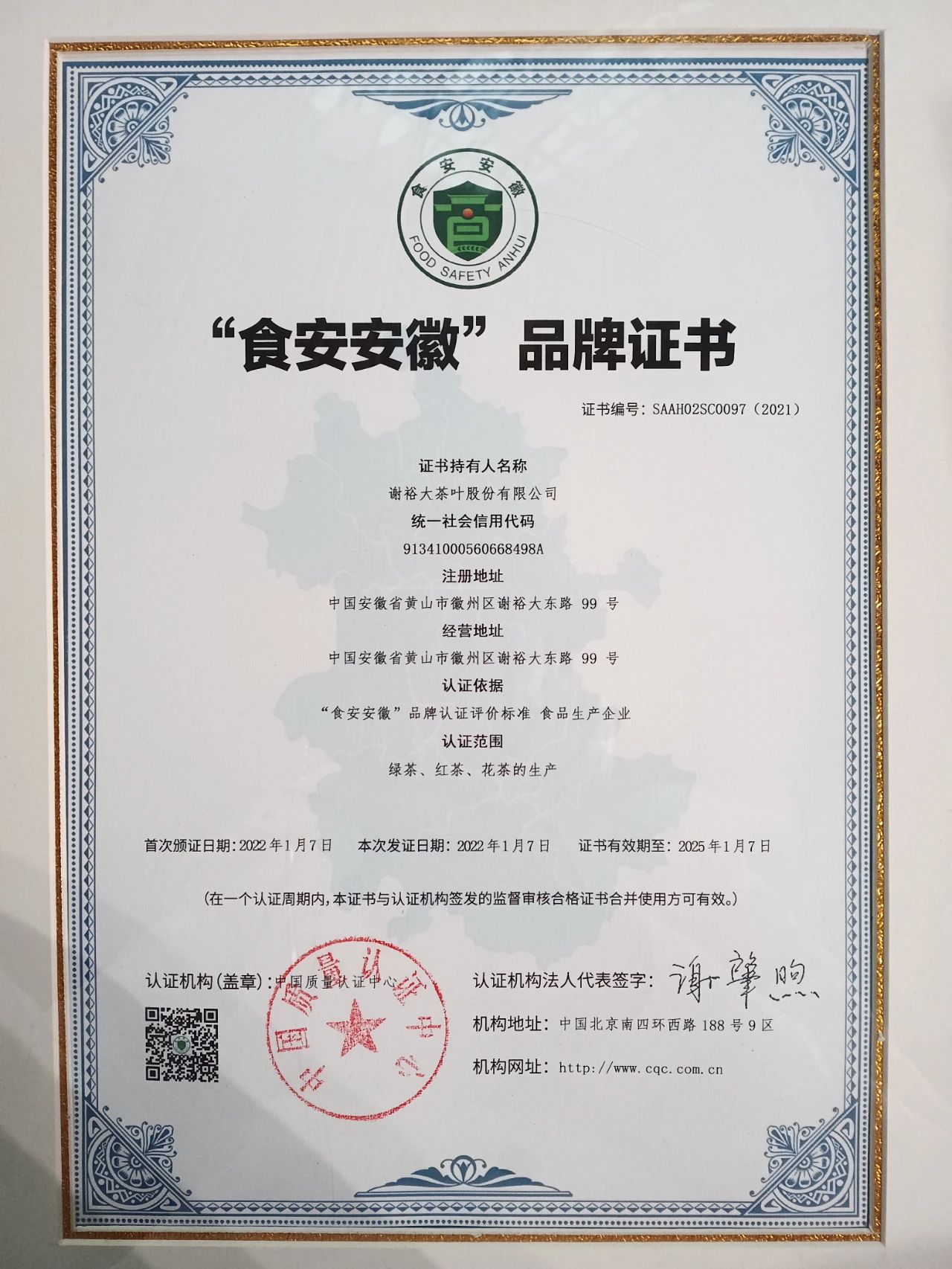 正是這份對食品安全的嚴苛把控、對技術創(chuàng)新的不斷追求、對品質(zhì)堅守的始終如一,讓謝裕大建立和通過ISO9001、ISO22000、ISO50001、ISO14001和ISO45001等多項體系認證,也榮獲了“食安安徽”首批認證企業(yè),“安徽省質(zhì)量獎”、“安徽省企業(yè)標準化良好行為AAA級示范企業(yè)”等榮譽。未來,我們也希望用更高標準、更高品質(zhì)的徽茶,增強“食安安徽”品牌影響力,助推黃山綠色食品高質(zhì)量發(fā)展,也讓世界感受到中國茶的盎然芬芳。