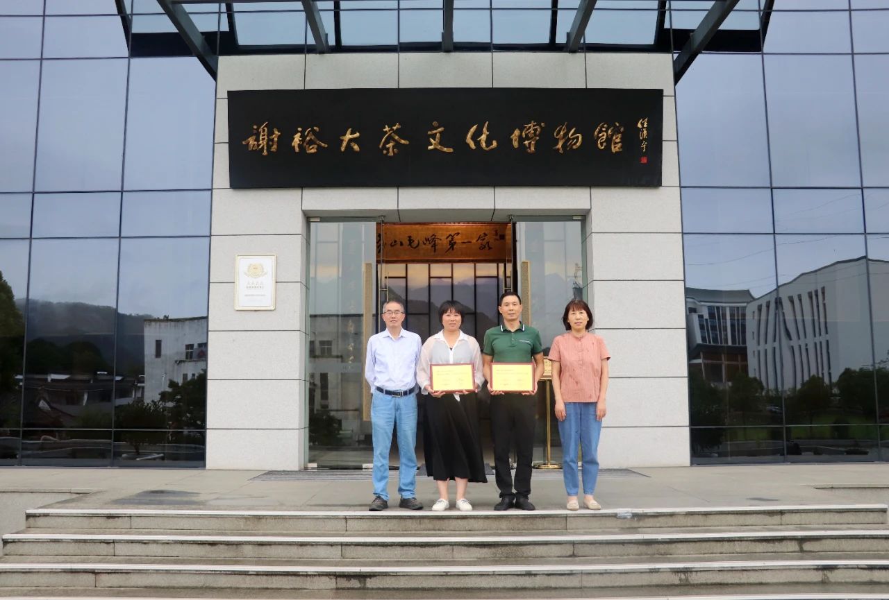 2023年8月30日,徽州區(qū)工商聯(lián)主席方秀莉、區(qū)青年商會辦公室負責(zé)人范秀明到訪謝裕大茶博園頒發(fā)營業(yè)收入百強及納稅百強榮譽,謝裕大行政中心總監(jiān)桂利權(quán)代表公司接受榮譽獎牌。
