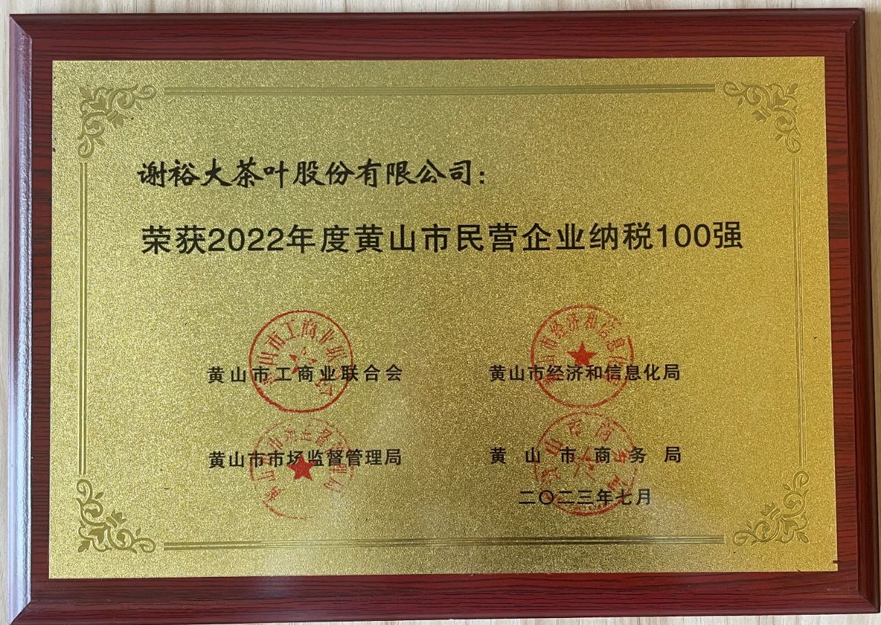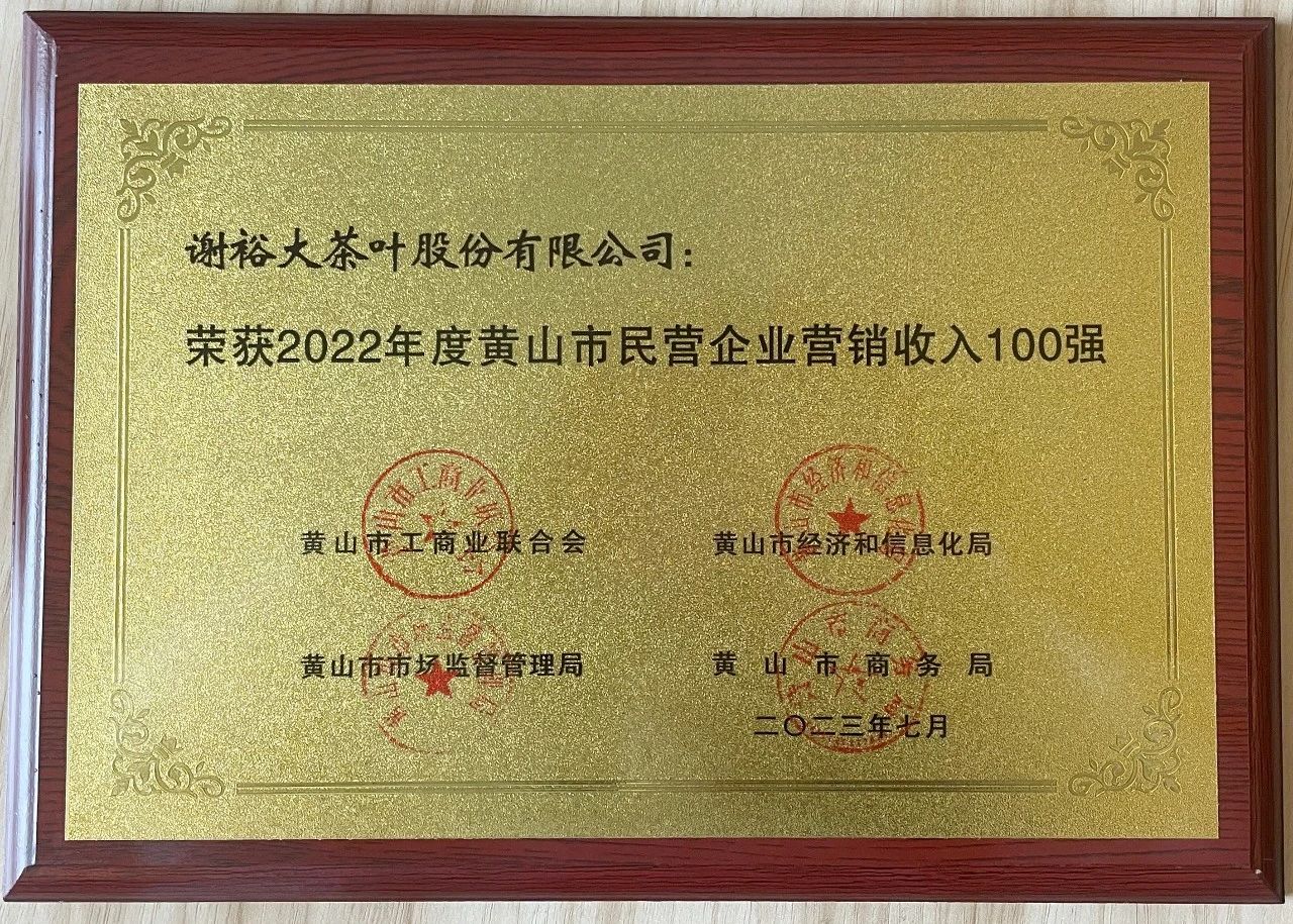 近日,黃山市工商聯(lián)、市經(jīng)信局、市商務(wù)局、市市場監(jiān)督管理局、市統(tǒng)計局聯(lián)合發(fā)布的2022年度黃山市民營企業(yè)百名排序結(jié)果公布,謝裕大茶葉股份有限公司榮獲2022年度黃山市民營企業(yè)營銷收入100強、2022年度黃山市民營企業(yè)納稅100強雙項榮譽。