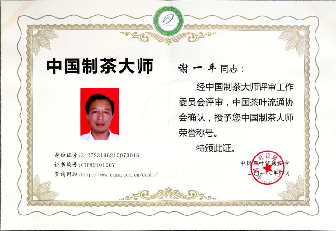 謝一平獲中國制茶大師認證