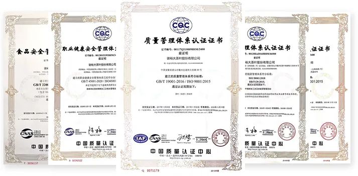 謝裕大積極務實踐行“質(zhì)量強企”的精神,建立了全過程質(zhì)量安全追溯體系,通過了ISO19001:2016 質(zhì)量管理、ISO22000:2018食品安全管理、ISO50001:2018能源管理、ISO14001:2015環(huán)境管理和ISO45001:2018職業(yè)健康安全管理等多項體系認證,確保產(chǎn)品從鮮葉釆購到出廠銷售所有環(huán)節(jié)都可有效追溯,提高茶葉質(zhì)量安全控制水平。