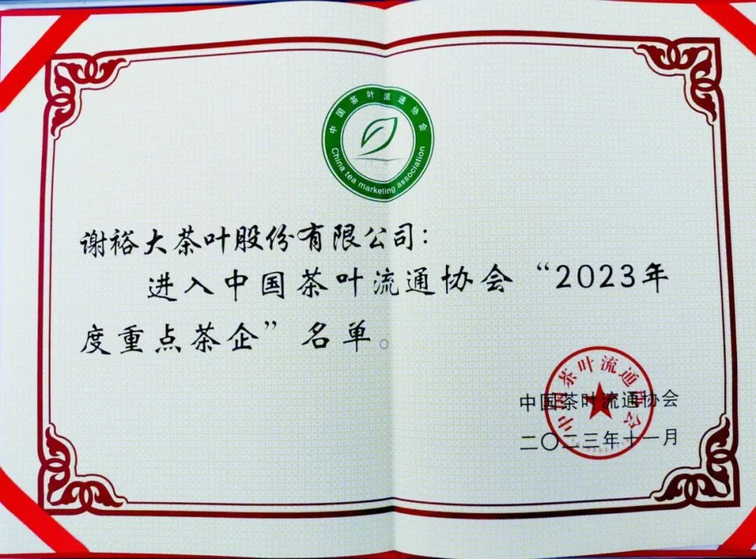 謝裕大榮獲“2023年度重點(diǎn)茶企”
