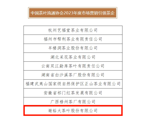 謝裕大榮獲“2023年度市場營銷引領(lǐng)茶企”