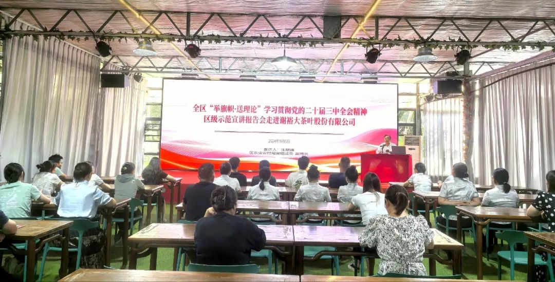 2024年9月6日,謝裕大在茶緣閣會場舉行“舉旗幟·送理論”學(xué)習(xí)貫徹黨的二十屆三中全會精神示范宣講報告會,徽州區(qū)農(nóng)業(yè)農(nóng)村局副局長朱曉峰作宣講報告,謝裕大包括黨員在內(nèi)各部門員工代表共同參加。