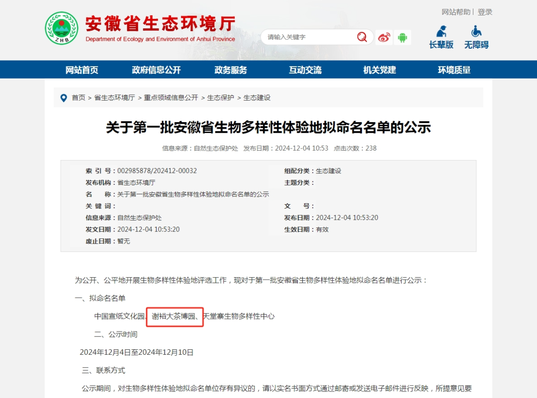 近日,安徽省生態(tài)環(huán)境廳公示了第一批安徽省生物多樣性體驗地擬命名名單,謝裕大茶博園憑借特色生態(tài)資源及豐富的茶文化榮幸入榜,成為全省唯一一個生態(tài)茶園類型生物多樣性體驗地!