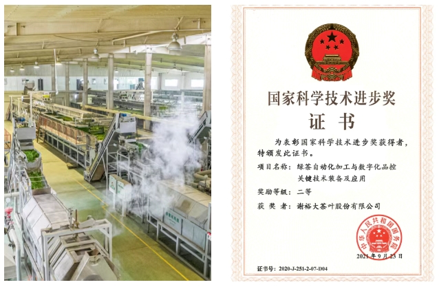 謝裕大公司作為主要參與單位,自主設(shè)計了黃山毛峰茶鮮葉貯青機、茶葉加工流量機、茶葉殺青機、自動稱重揉捻機組和開發(fā)了首個茶葉生產(chǎn)線智能控制系統(tǒng),突破了綠茶加工溫度精準控制、連續(xù)化揉捻及做形等技術(shù)瓶頸,創(chuàng)建了綠茶自動化加工技術(shù)體系及生產(chǎn)線,實現(xiàn)了生產(chǎn)線遠程視頻控制、茶葉數(shù)字化加工和車間無人化管理。此外,公司擁有13項發(fā)明、19項實用新型專利和1項國家級茶樹良種(漕溪1號)認定、國家科技進步獎二等獎1項,通過科技創(chuàng)新推動精益發(fā)展,企業(yè)生產(chǎn)質(zhì)效逐年提高。