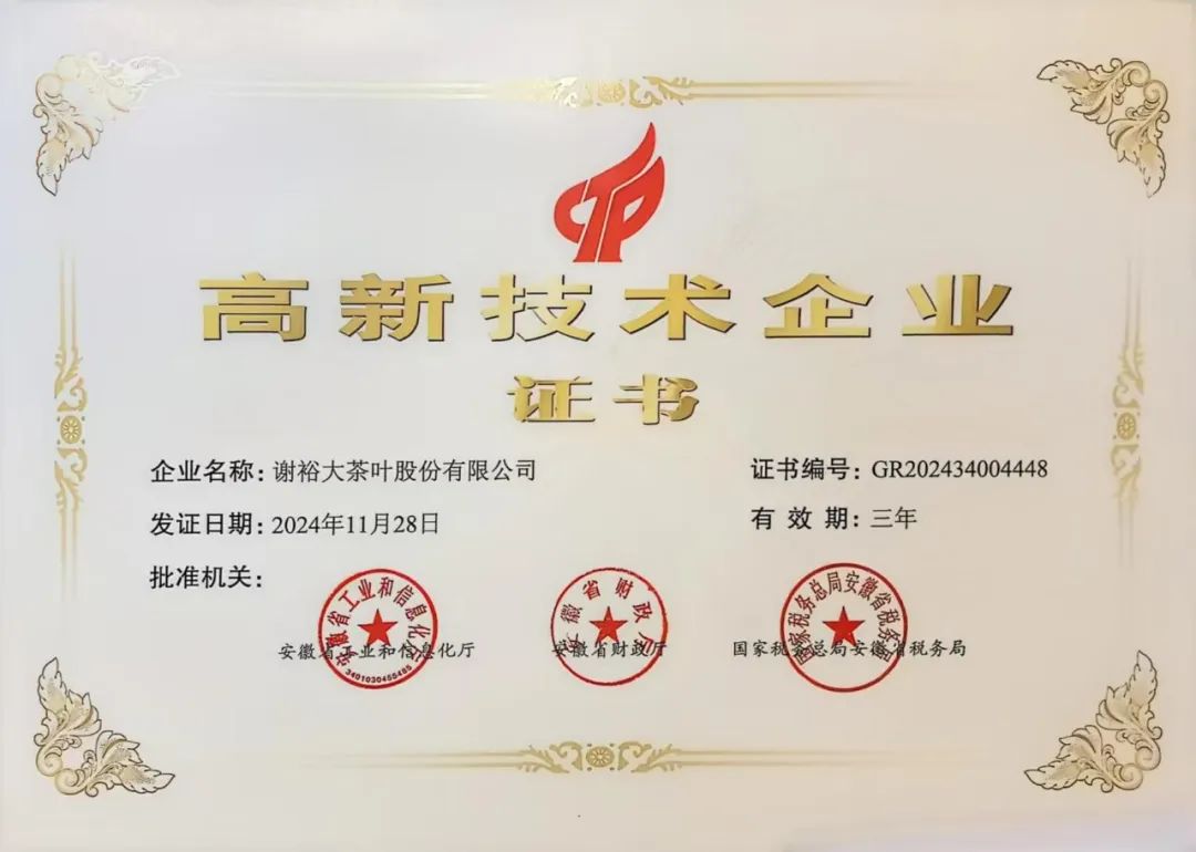 連續(xù)5次獲評高新技術(shù)企業(yè),是國家相關(guān)部門對謝裕大長期堅持三茶統(tǒng)籌發(fā)展,堅定走高新技術(shù)發(fā)展道路的高度認可。未來,謝裕大將繼續(xù)發(fā)展新質(zhì)生產(chǎn)力,持續(xù)注重自主創(chuàng)新、加大科技研發(fā)投入,凝練和創(chuàng)新產(chǎn)業(yè)先進的技術(shù)手段,為行業(yè)高質(zhì)量發(fā)展注入創(chuàng)新動力。