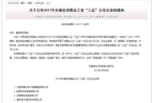 安徽省消費(fèi)品工業(yè)“三品”示范企業(yè)